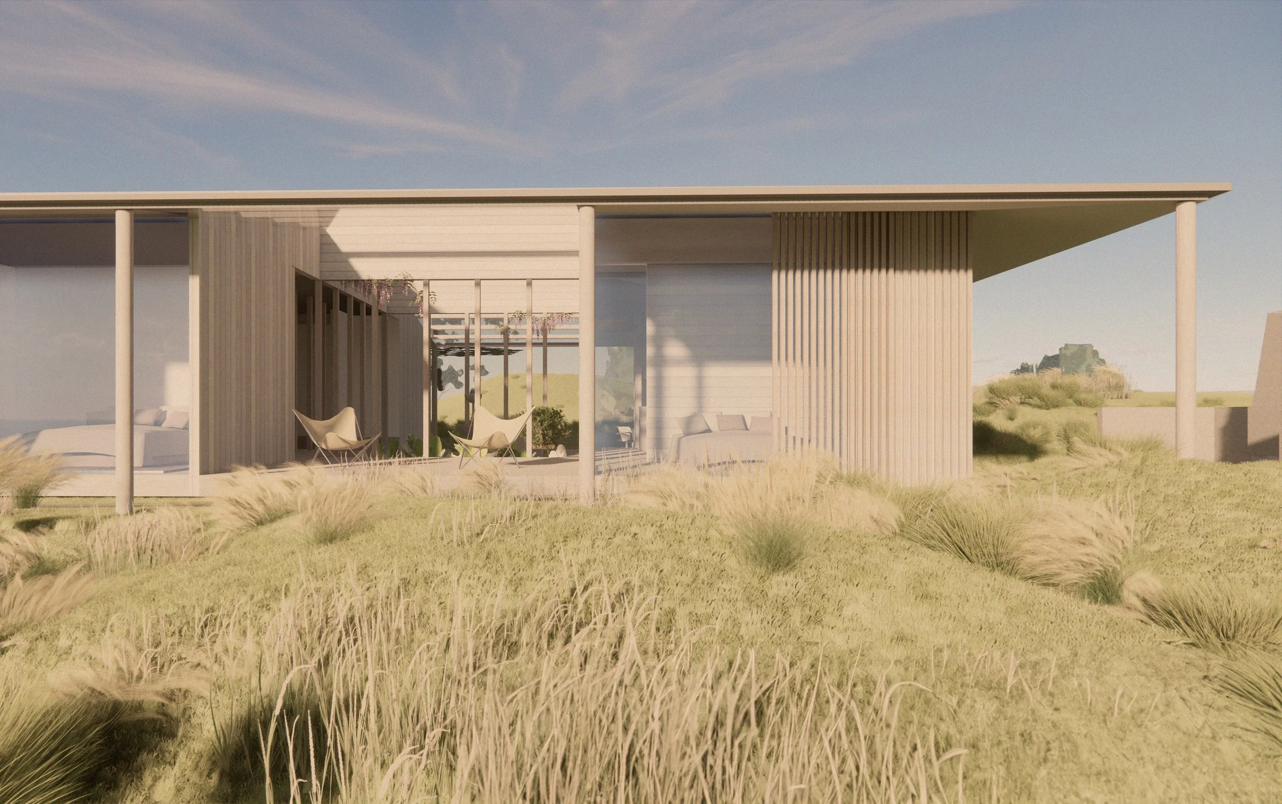 NZ beach house meets Palladian Villa. Palladian principals of a central courtyard, no corridors and an axial processional route are layered into this rural beach house on the Kapiti Coast. The result is a nontraditional beach home providing sanctuary from the harsh coastal conditions.