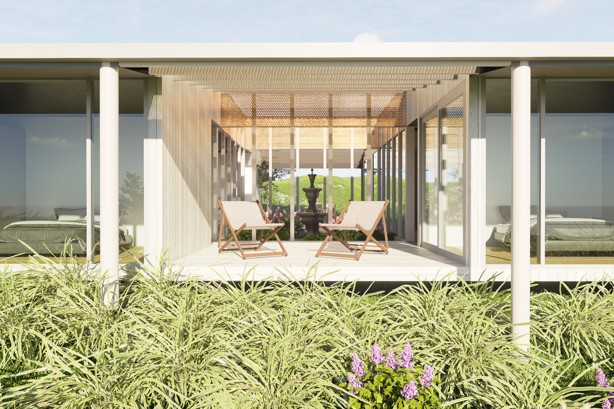 Rooms are positioned at the corners to shelter the decks between from the prevailing winds.