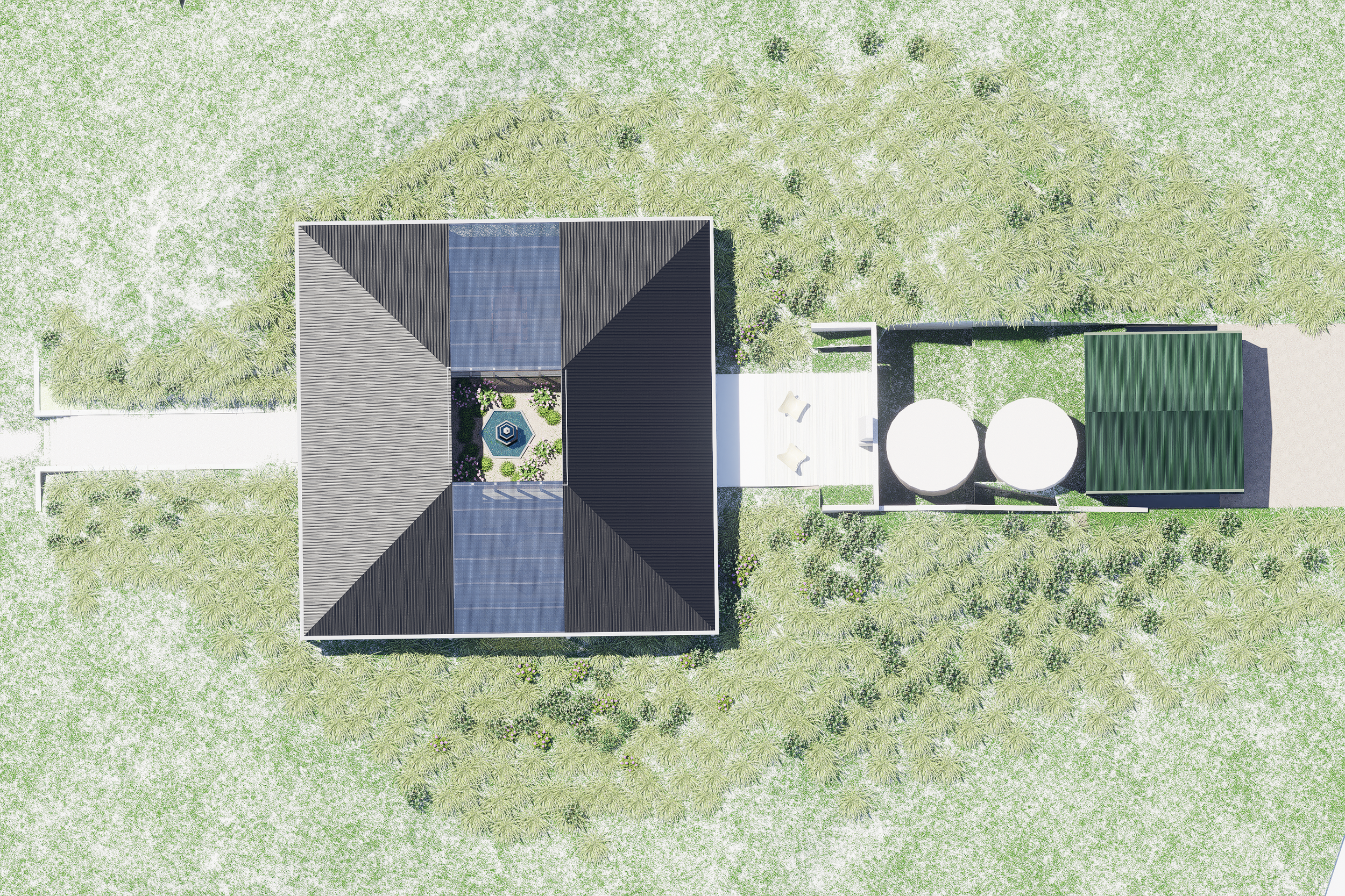 The kitchen, bedrooms and the workshop surround the courtyard, whole two outdoor rooms, nestled between the courtyard and adjacent rooms, allows for outdoor living. Screens slide across to enable these outdoor rooms to be utilised even in poor weather.