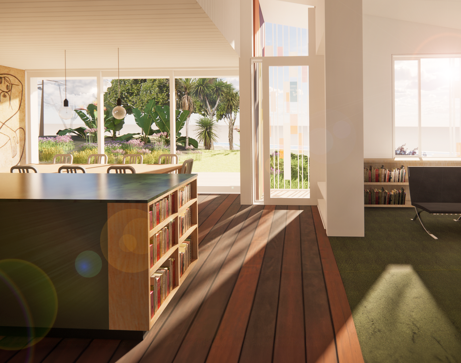 The dining room opens out to a covered seated area from which a lush, flat tropical garden can be viewed and accessed. A walled raised fernery garden is viewed from the kitchen like a little zen jewel which animates this space. A second fernery garden is housed between the living the bedroom wings, providing a joyous transition and play of light to the middle of the house.