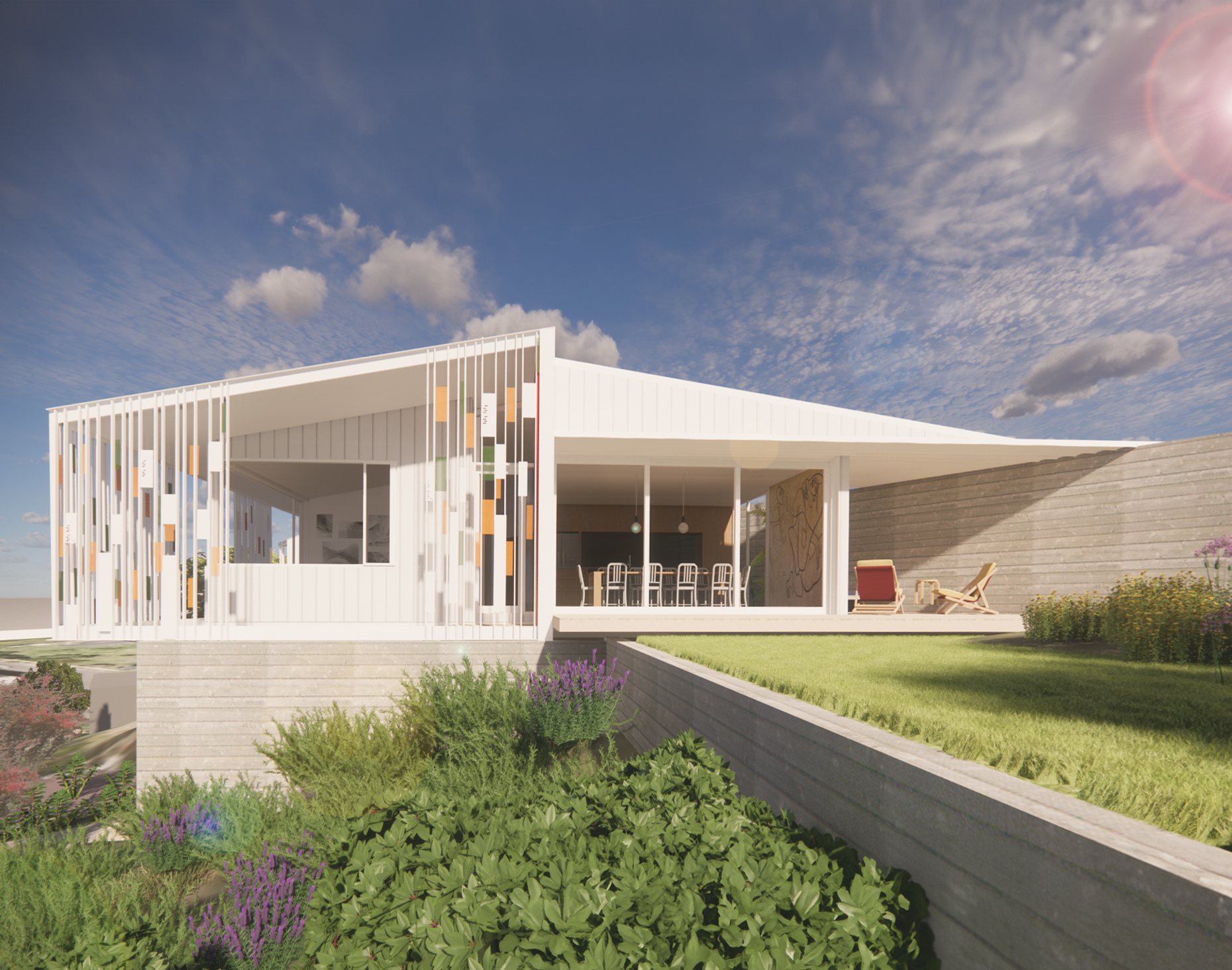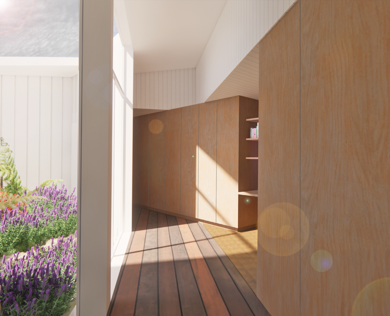 This is a new retirement house for two avid gardeners. With the garden and qualities of light as the focus, the house aims to be a neutral vessel in which to connect to the immediate and broader environment. A series of screens filter light like the dappled shade of a tree, animating the interior, screening off views of suburbia, and providing solar control.