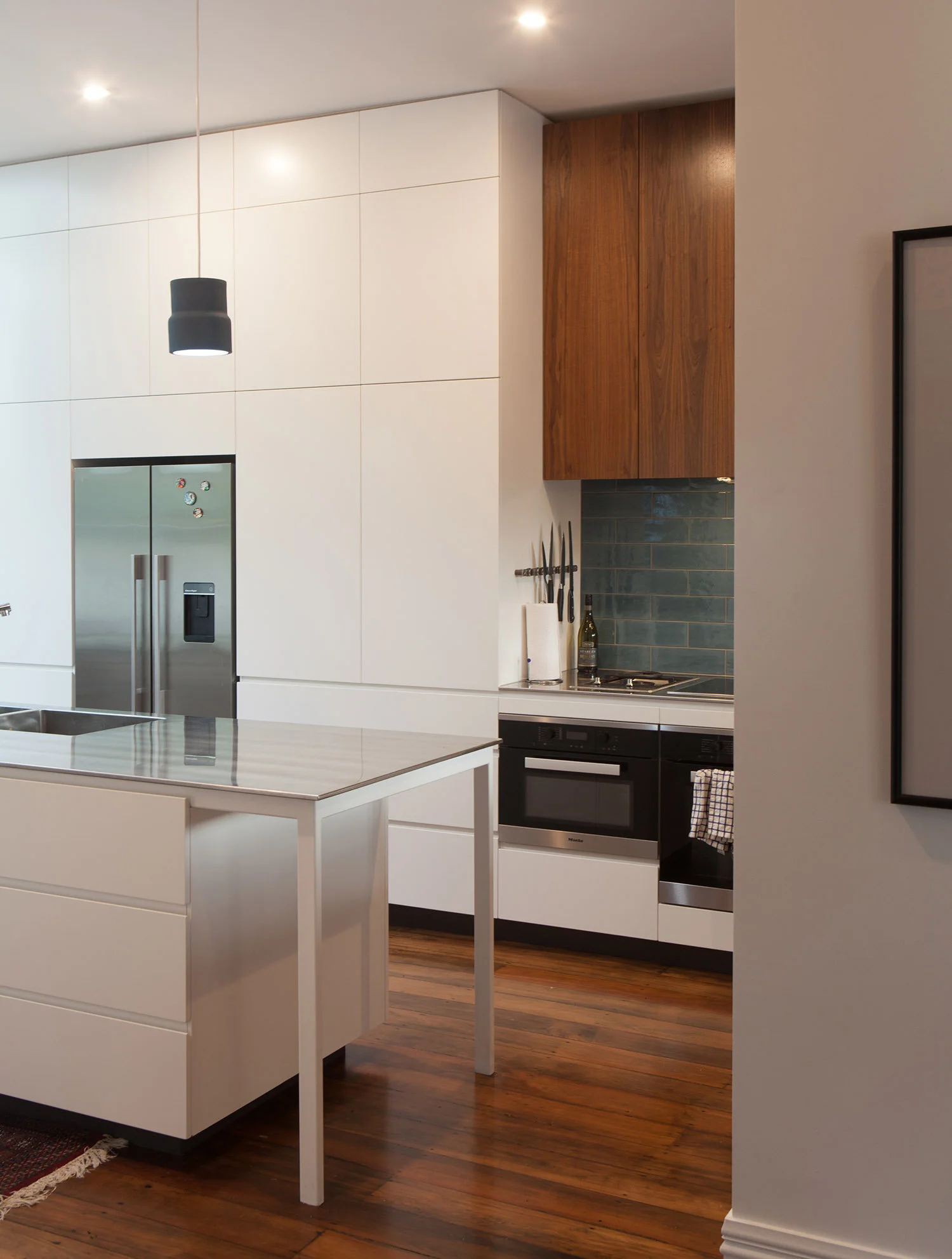 The approach we took was to open up the existing dark rear of the house from above, which created a light-filled kitchen heart connecting to the living areas. Clean crisp lines marry with rich timber joinery and detailing to complement the existing material palate of the villa. Upstairs, we updated the bedrooms and bathrooms to be warm and well planned, with an overall modernisation sympathetically acknowledging the house's heritage.
