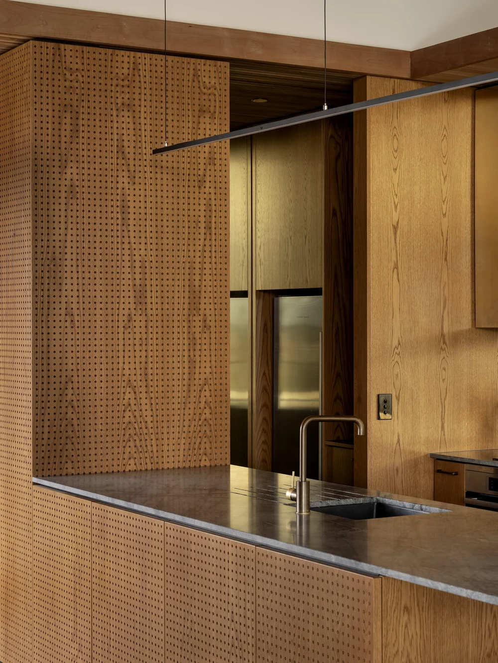 In plan, the house follows the contour of the land, with the kink creating a sheltered courtyard and an entry space that mediates between interior and exterior.A standalone crib for family and friends nestles above the main house.