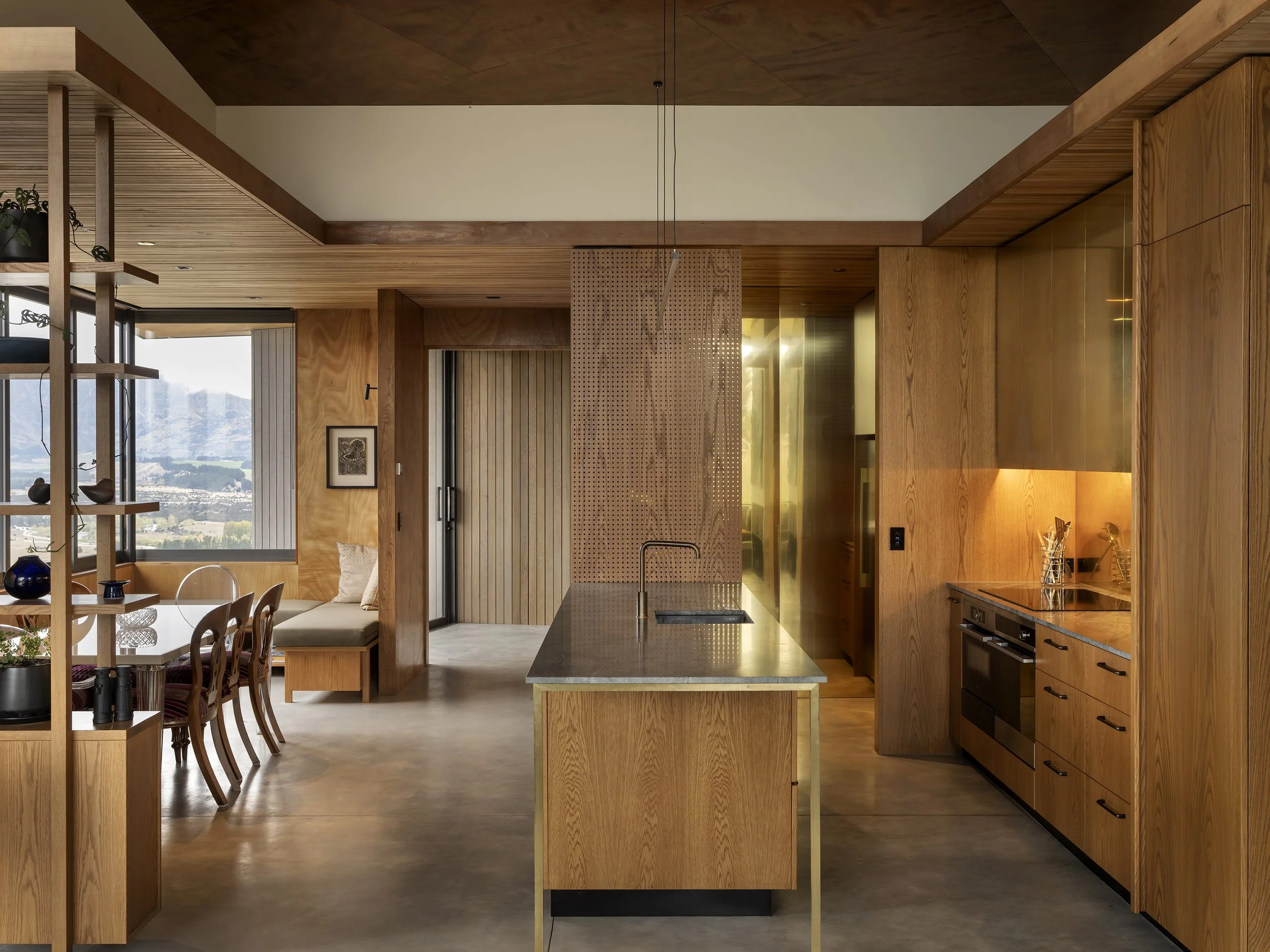 Sustainable materials with natural tones were chosen to blend in with the surrounding schist and kanuka. Over time, the building’s cladding will weather, taking on the silvered patina of the surrounding native bush. The raw concrete floors align with the tonality of the schist bedrock, bedding it into the site.