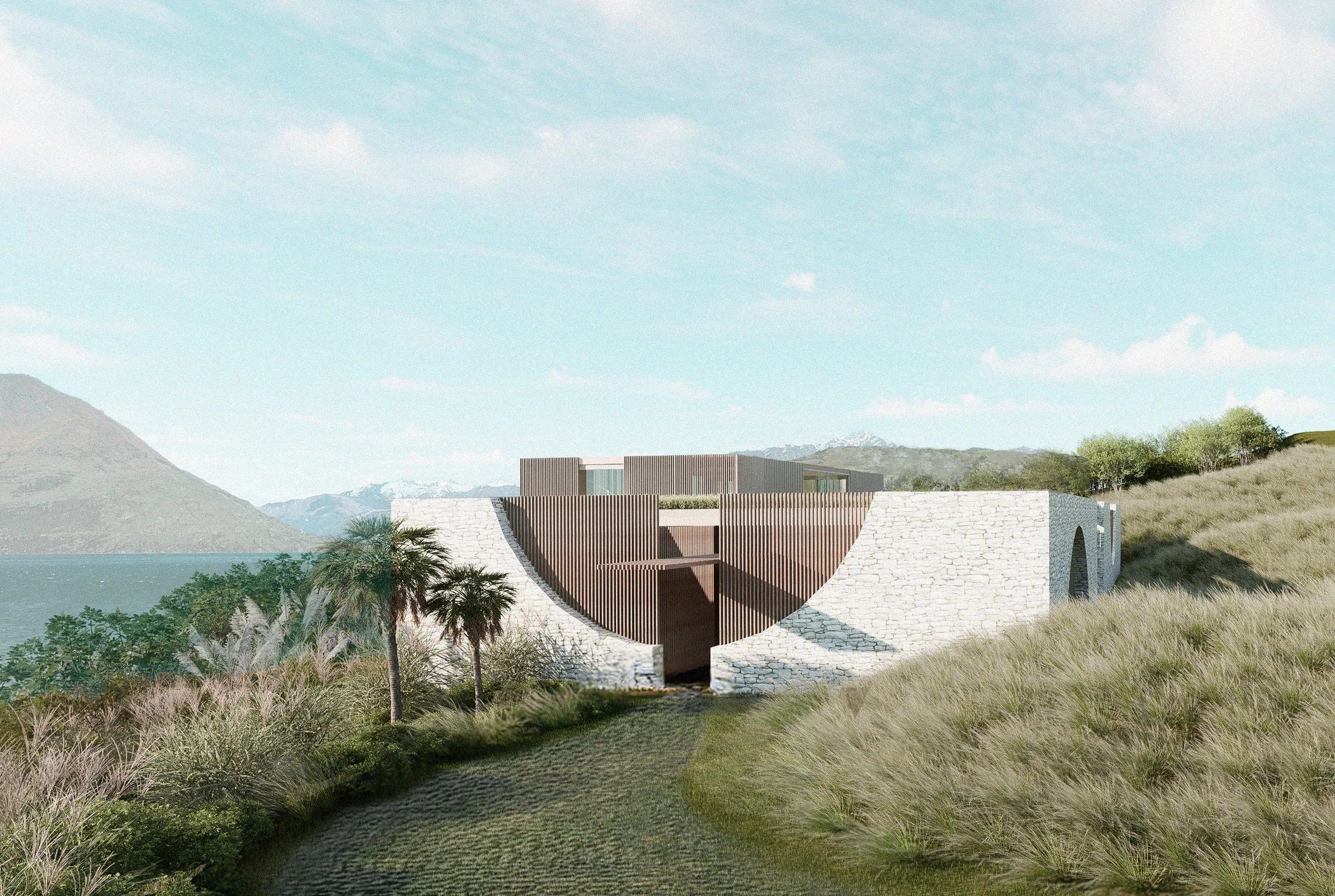 The ground floor has a square courtyard floor plan that is buried into the hill on three sides, reducing the bulk of the home visually on the site and protecting it from the elements. The perimeter stone clad walls extend out of the hill to create a sense of solid shelter from wind and rain, behind which are the softer intermediary spaces and internal courtyard. These walls define the line where the wild rural paddocks end, and the more sheltered domestic spaces of the home begin. The green roof above extends out from the hill, blurring the line between where the hill ends and the house begins.