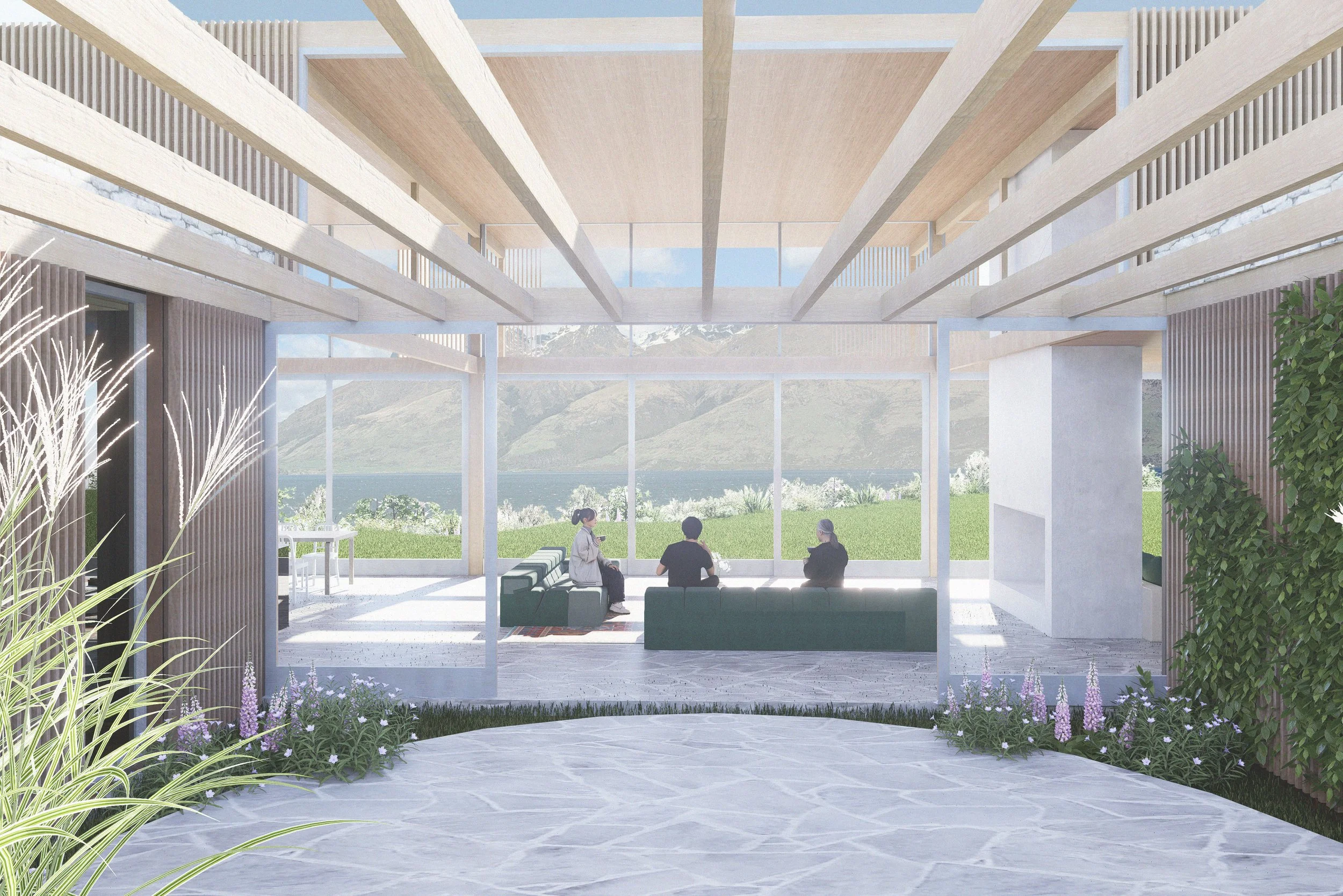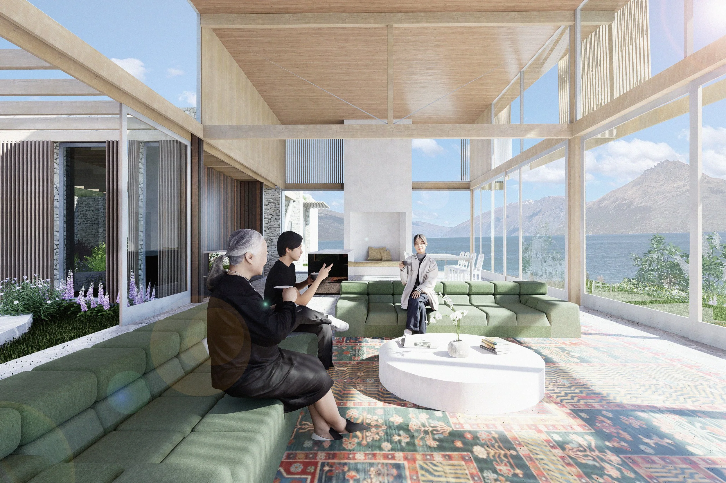 This is a large new family home aiming to sit subtly on its site and provide shelter and connection to land and whanau.