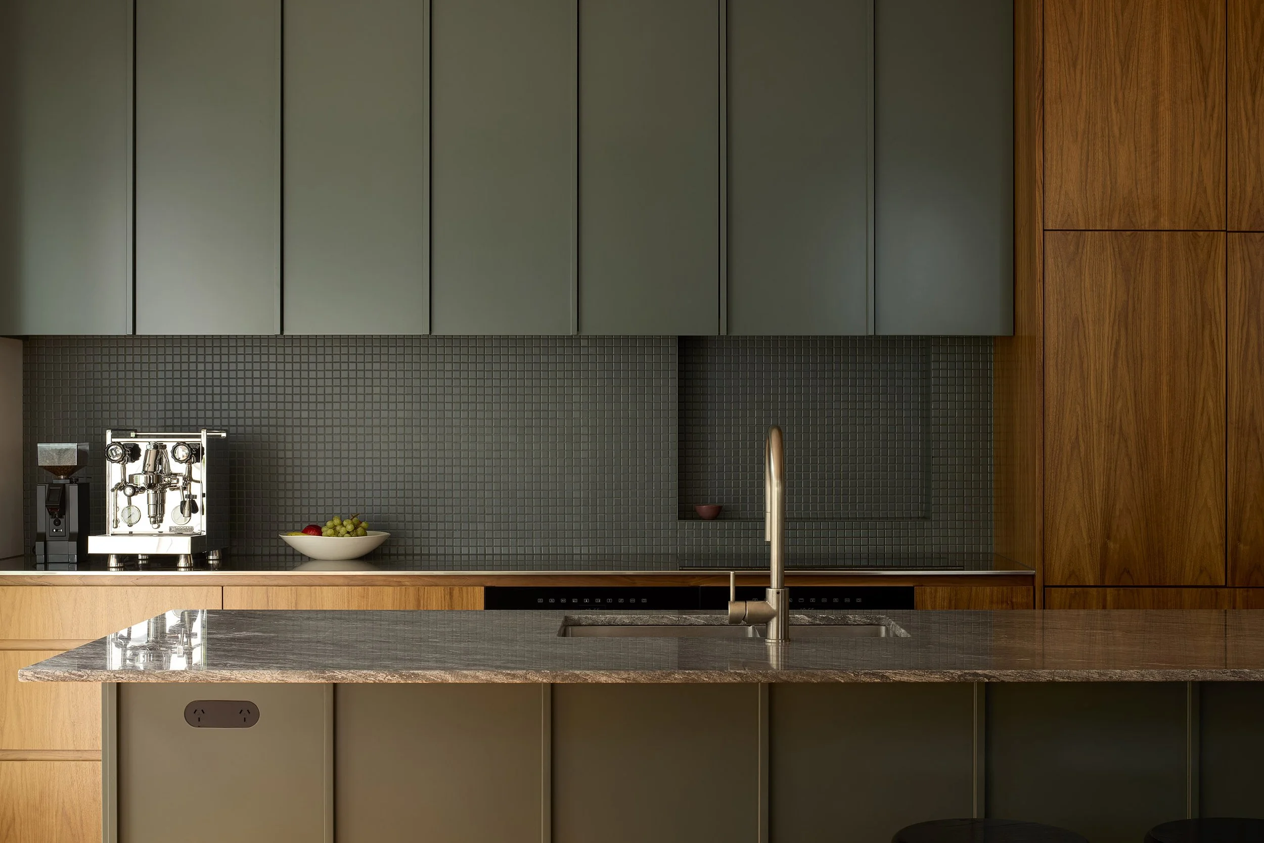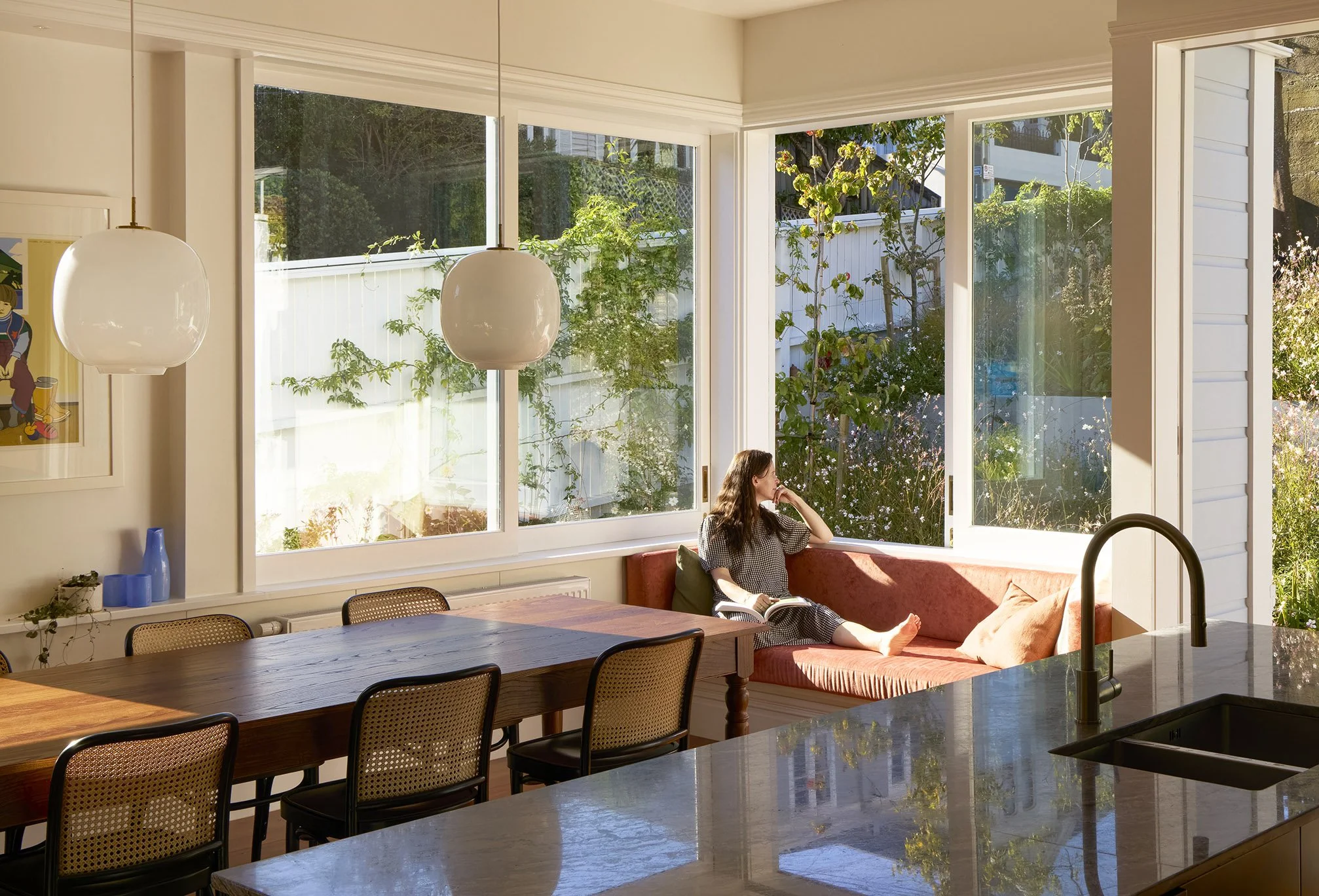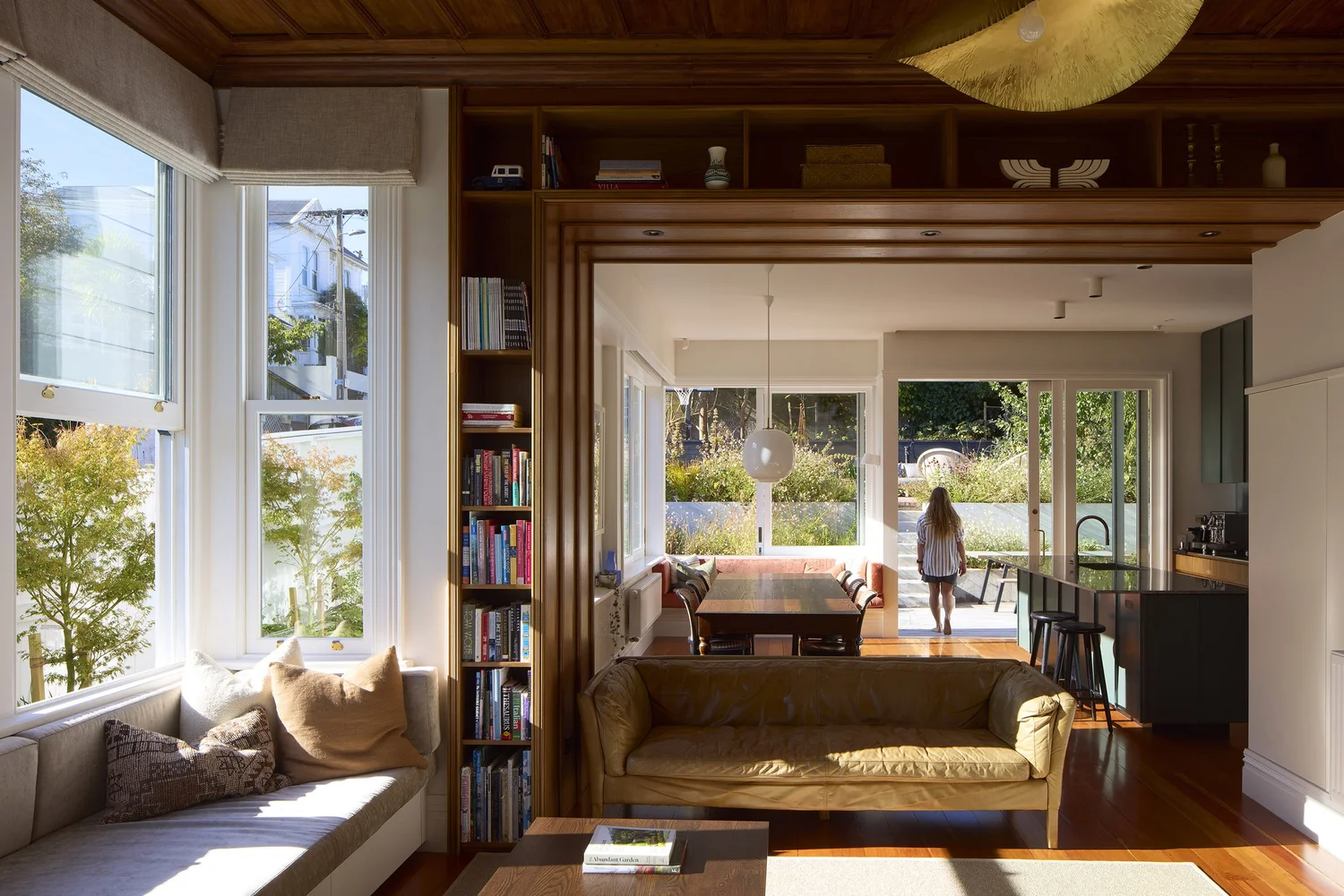 The modern kitchen takes its cue from Victorian detailing, whilst the generous stud and timber floors have been carried through. Contemporary timber sliding doors and windows have been chosen to match the villa joinery and are in scale with the original double-hung sash windows. They provide Northern light and strong connections to the garden beyond.