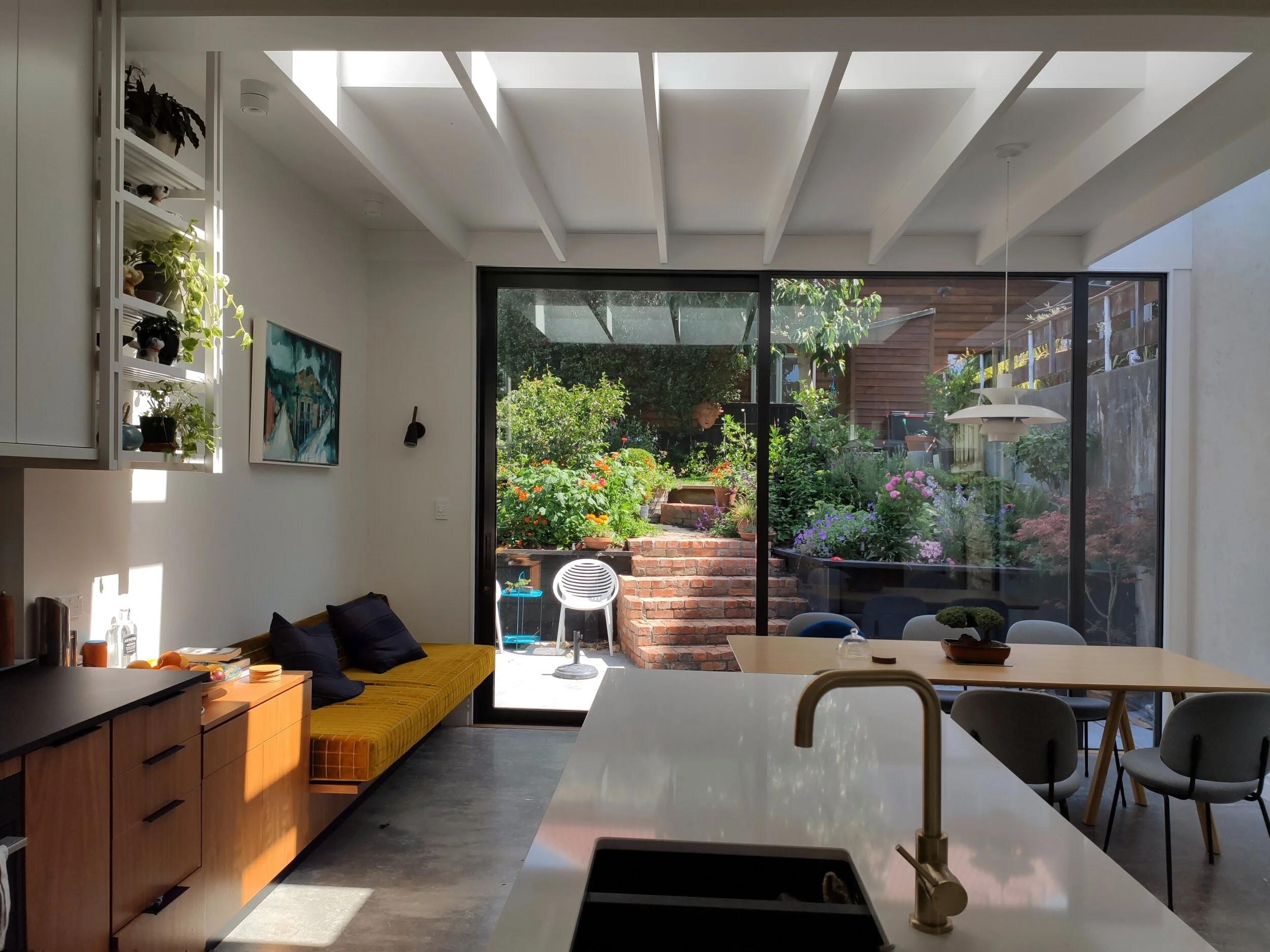 House renovation in Wellington. A dark, narrow Thorndon cottage was in serious need of a renovation. A sun-catcher extension injected light into the living space, a dining area provided some much needed breathing room, and a back-garden courtyard extended dining and living into the garden.